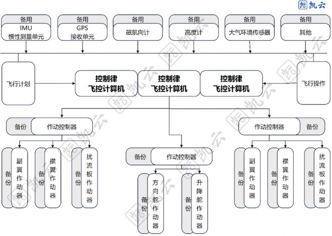 飞控计算机是飞行控制的核心处理器。它实时接收来自传感器(如IMU、GPS、大气数据)的状态信息,并依据预设的控制律进行计算,生成精确的控制指令。随后,这些指令被发送至作动控制器,驱动各个舵面(如副翼、升降舵、方向舵)的作动器,从而控制飞机的姿态与航迹。整个过程形成一个高速闭环:飞控计算机不断比较实际飞行状态与期望指令(来自飞行计划或飞行员输入),通过计算差值并输出纠正信号,实现对飞机的稳定、精确操控,其核心原理是基于反馈的自动控制。