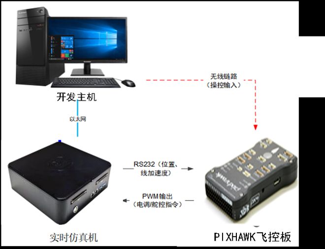 操作员使用工装测试软件,根据所需的飞行器运功,将舵面操纵指令以mavlink协议格式通过RS232串口发送到PIXHAWK飞控板上。
