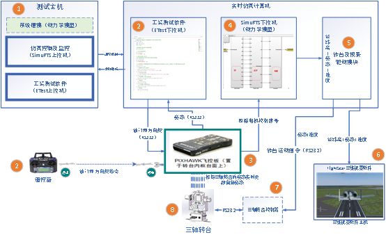 三轴转台接受到控制器发来的运动指令,精确地按照仿真计算出的姿态和角速度进行运动。这不仅允许用户可以直接看到模拟出的空中姿态变化。同时,安装在转台上的真实飞控板,会感知到转台的运动,并根据其自身的控制律和传感器数据,实时对原始的油门、副翼、升降舵、方向舵控制信号进行闭环微调,以满足飞行的稳定性和性能要求。