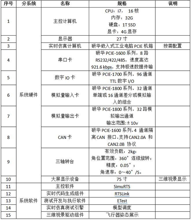 核心设备:主要为主控计算机、实时仿真计算机、通讯板卡和大屏显示器。实验人员可以在主控计算机中设计和开发飞行动力学模型,通过实时仿真计算机和通讯板卡进行半实物仿真测试,支持飞控计算机/飞控板、舵机、导航设备等实物的接入。